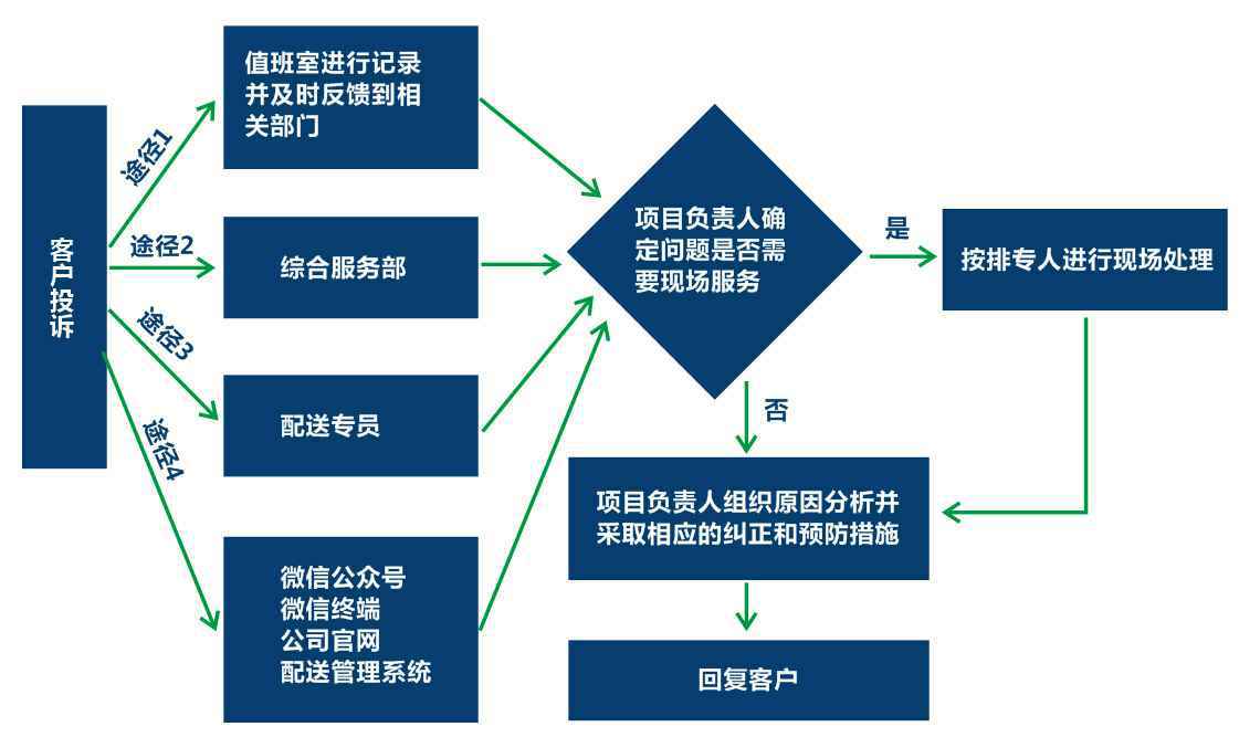 在日常配送过程中,客户可按如下流程及时向我们投诉和建议,我司将在2小时内处理各种投诉和建议。如有必要的情况下,将启动应急响应机制,解决配送过程中出现的各种情况。